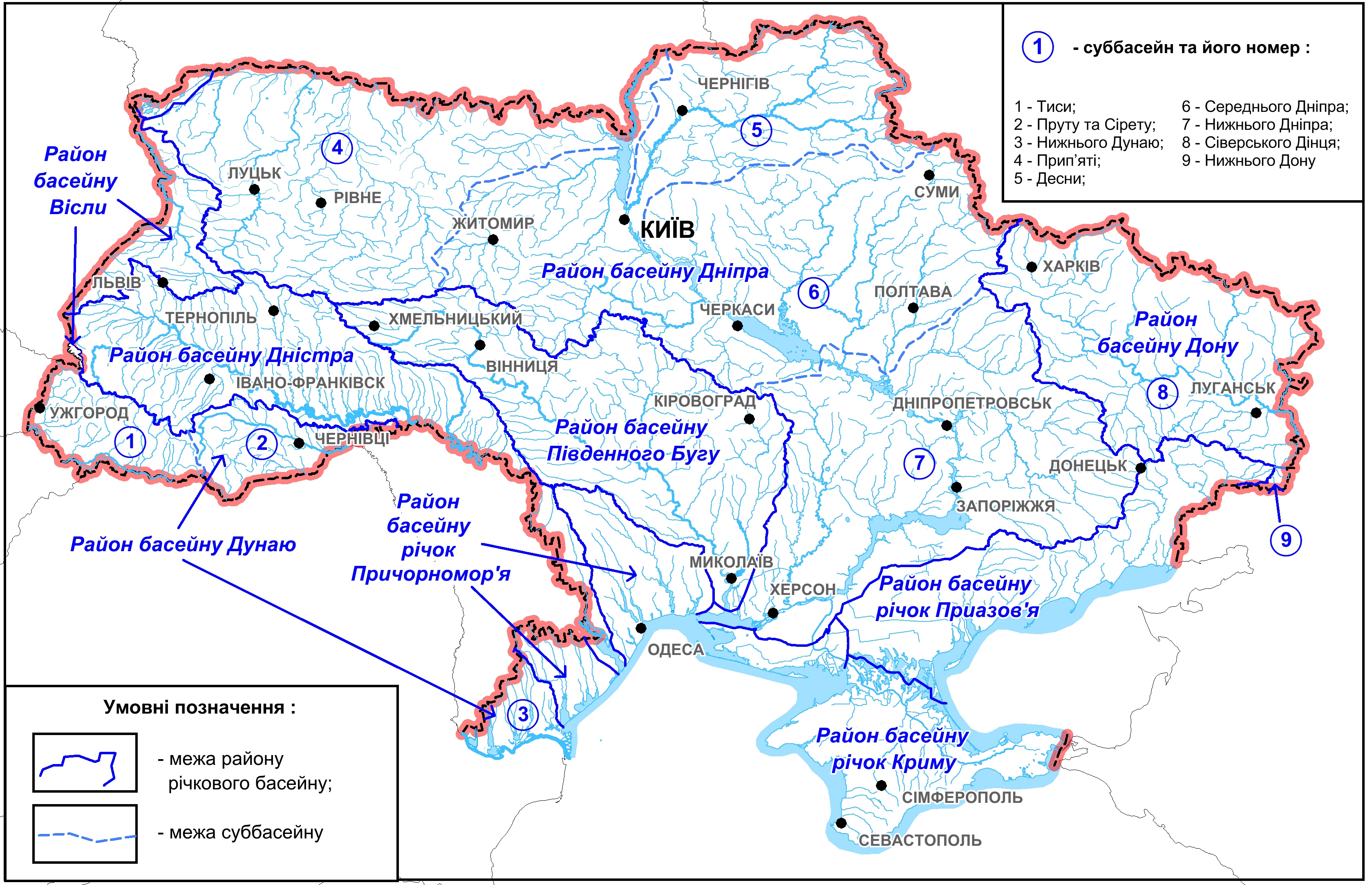 1) загальна характеристика поверхневих та підземних вод району річкового басейну;
